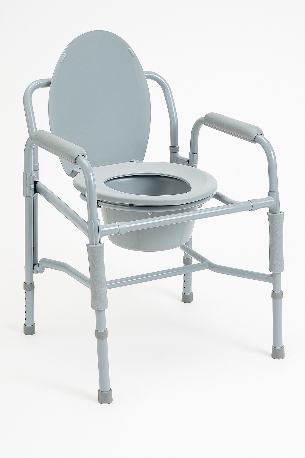 A portable toilet chair designed for patients with limited mobility, offering easy side transfers with drop arms for added safety.